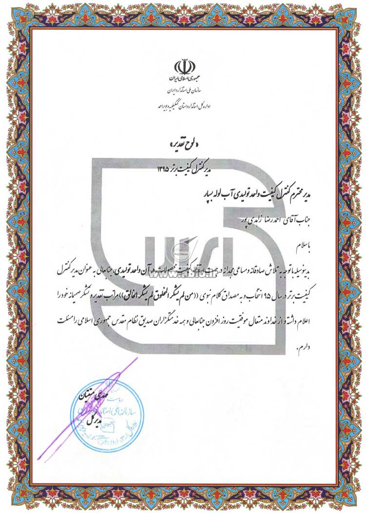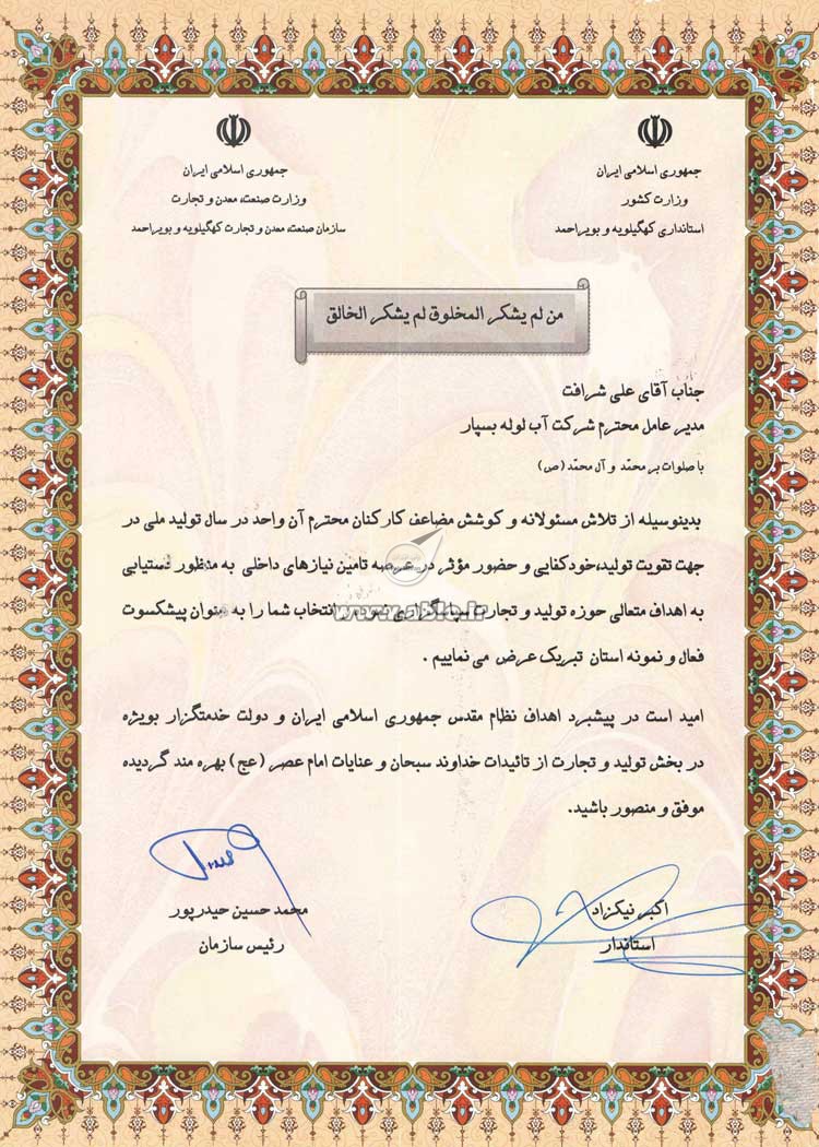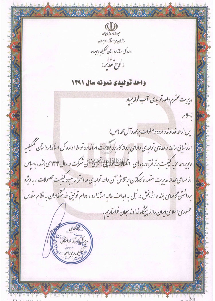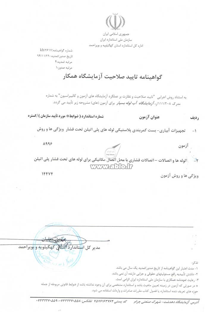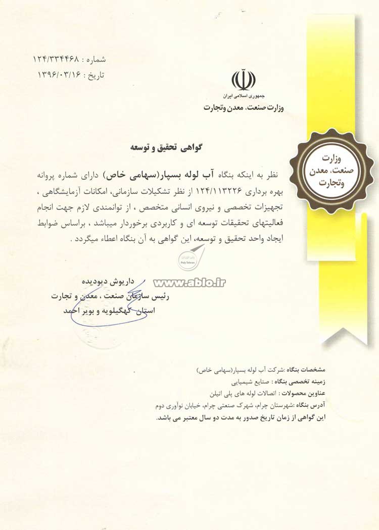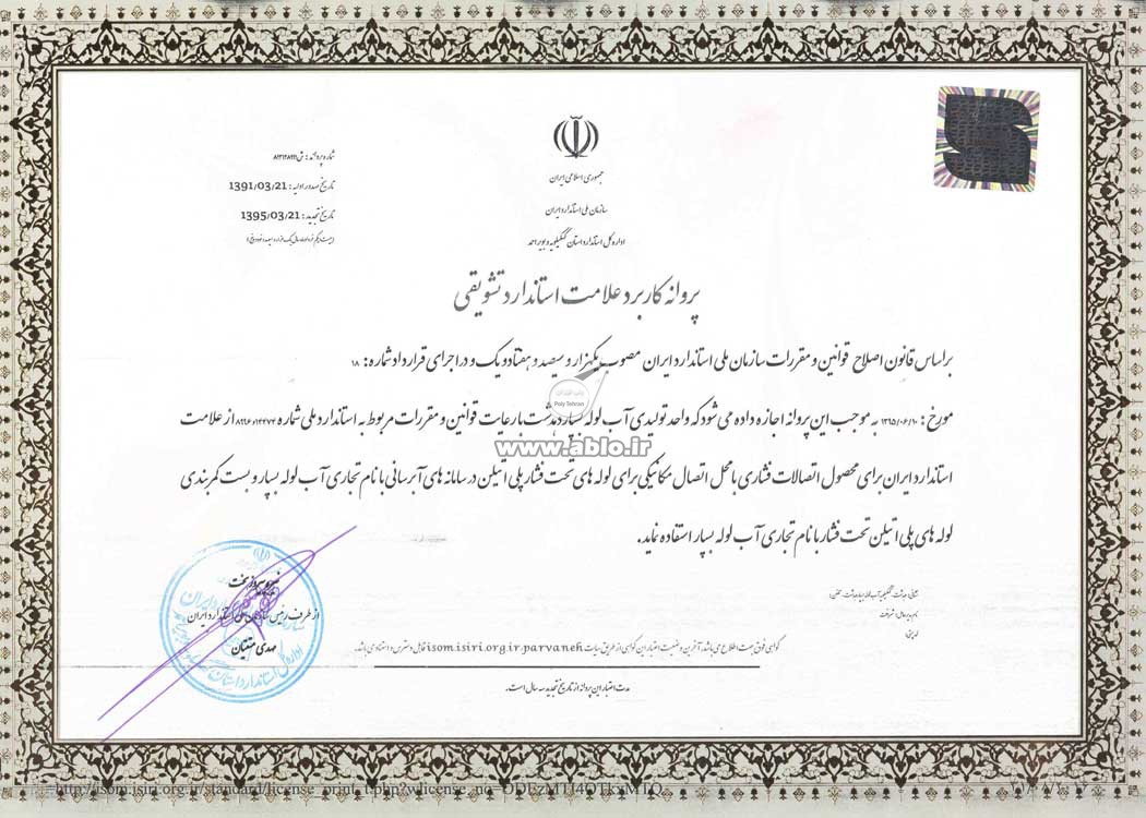 تاییدیه ها، مجوزها و تقدیر نامه های آب لوله بسپار