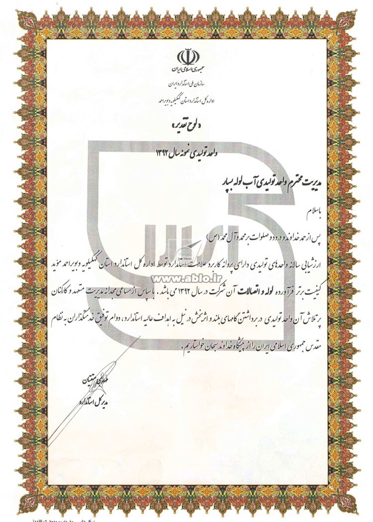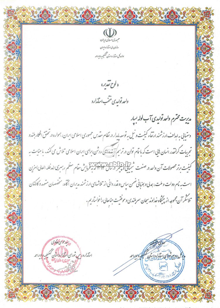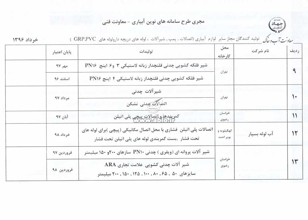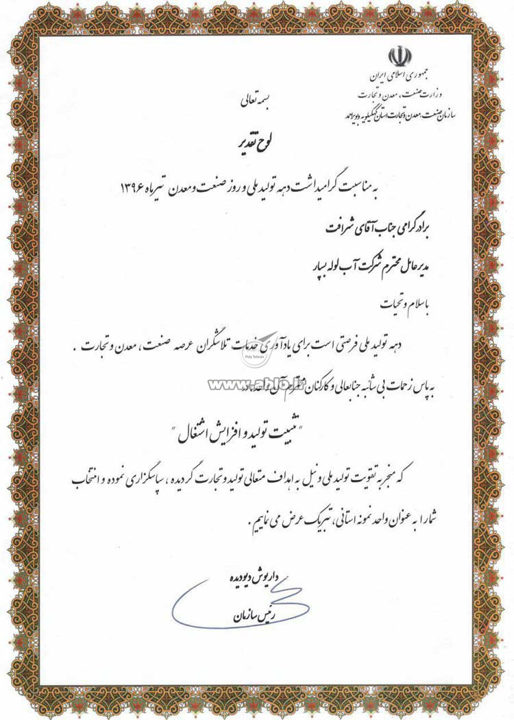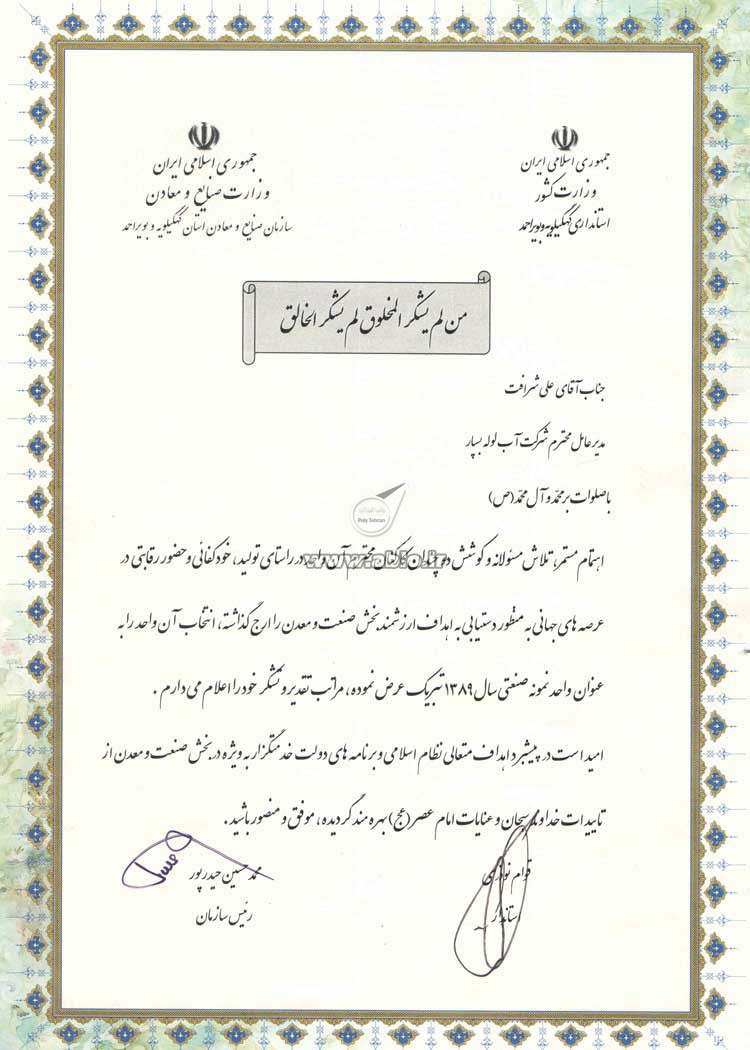 تاییدیه ها، مجوزها و تقدیر نامه های آب لوله بسپار
